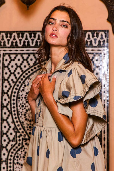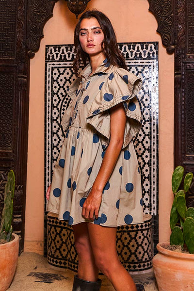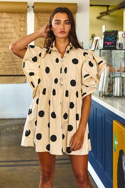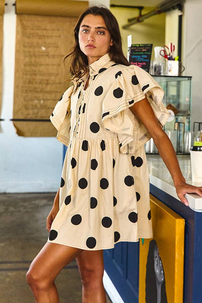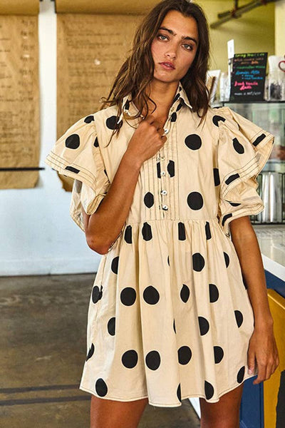 Ruffle Sleeves Pintuck Detail Polka Dot Print Mini Dress - Short flutter sleeves - Collared - Side pockets - Button-up front - Babydoll design