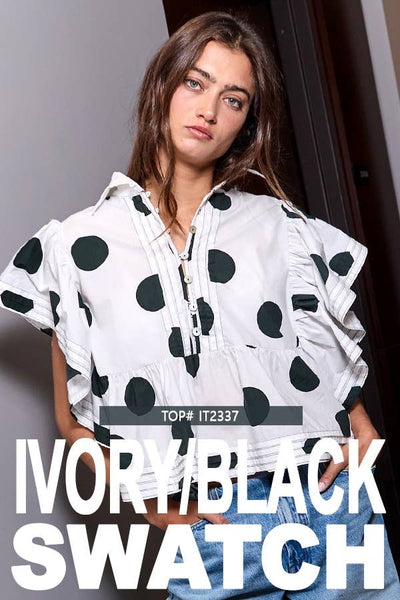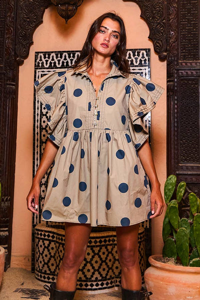 ID4283 Ruffle Sleeve Pintuck Detail Polka Dot Mini Dress