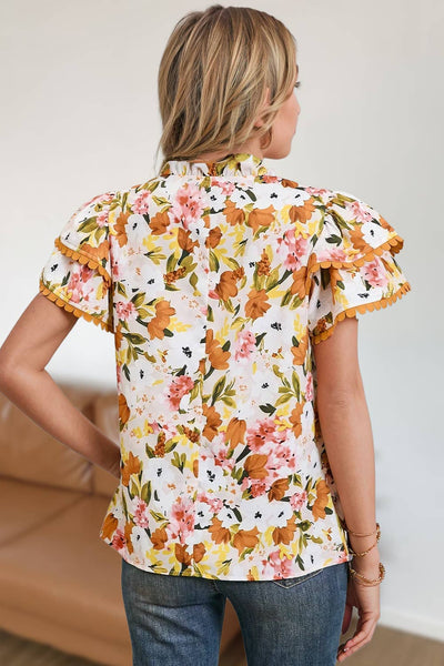 Brandi Ruffled V Neck Scalloped Short Sleeve Floral Blouse